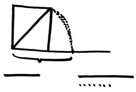 Now, we take the diagonal of the square: Let's look at its length in terms of the original line that we had (Figures 4-5). How are we going to get it? It wasn't twice as big, it wasn't one and a half times as big. And the square of 2, does anyone know how big it is? Wow, it is somewhere between 1 and 2, and there is a whole infinity of numbers between those. You get one and one-half, one and one-third, one and one-fifth, one and two-fifths, one and three-eighths, there is an endless supply of numbers there. But nobody in here, with a whole infinity of numbers, can say what it is? Even though it is right there, plain as day in front of us, it's just the size of a square right there, the diagonal?