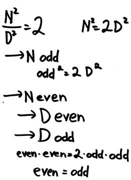 The odd part square on the top is twice something else, and if you've got twice something, it is going to be even. So you can divide it into two parts. Has anybody seen an odd number squared that became even? Does that ever happen? So we failed. Maybe the numerator is even, maybe that is the trick. And if the denominator is also even, then you can divide both of them by 2, and again and again, until you get one of them to be odd. So, let's say the denominator is odd. An even number times itself is twice an odd number times itself. The thing is, if you get rid of this 2 in front of the two odd numbers, you cut it in half, it's still even on the left. And an even number can't be an odd number. So, we really have found something that we honestly can't express with our numbers. We can find things that we can't solve by analyzing with what we already know.