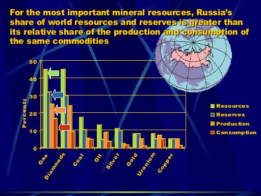 And Russia is really rich. Looking at a list of commodities which are very well known in Russia, you may see that Russia's resources, in relation to world resources, is impressive. In the area of energy resources, Russia has 32% of the world's gas, 12-13% of the oil, and 12% of the coallooking just at the world's explored reserves. Russia has 40% of the world's platinum and 90% of the palladium. If we look at rare Earth elements, Russia has 35% of the niobium, 80% of the tantalum, 50% of the yttrium, 28% of the lithium, 15% of the beryllium, and 12% of the zirconium. Russia's share of other metals used in industry is 36% of the nickel, 27% of the iron ore, 27% of the tin, 20% of the cobalt, 16% of the zinc, and 12% of the lead. Russia also has agrochemical ores, ranking first in the world in deposits of potassium salts, and second for apatite and phosphorite. Russia has the largest diamond resources in the world, and ranks third in gold.
