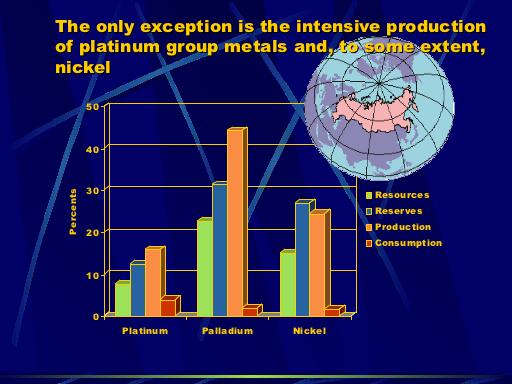 But what I can add to what Professor Menshikov said about the Russian situation: First of all, here you may see that, in terms of resources and reserves, Russia has a relatively big share in world resource reserves (Figure 1). But, it has much less of a share in production, and a very small share in consumption. It looks a bit different, just for the platinum group elements and nickel (Figure 2). But the platinum group elements and nickel are being mined mainly in Norilsk, which is far above the Arctic Circle. The photo shows a regular Winter day in Norilsk. The first house was built in Norilsk something like 50 years ago.