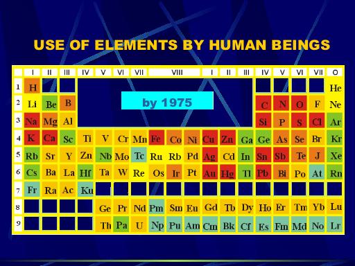Through the history of humanity, we used more and more different elements. In antiquity, people made use of only 18 of the elements. By the 19th Century, after the Industrial Revolution, 67 elements were in use. Since the harnessing of the atom and the synthesis of new elements in the 20th Century, almost the entire Periodic Table of the Elements has been used by human beings.