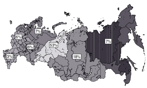 Nevertheless, this is the distribution of mineral resources by Federal District (Figure 3). And when you see the very big figure of 53% in the center, the Ural Federal District, it is due to very well developed oil and gas provinces, east of the Urals. The relatively low figure in the East shows that the area, in fact, is not very well explored.