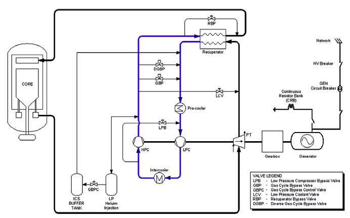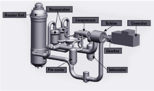 The thermodynamic cycle used is a Brayton cycle with a water-cooled pre-cooler and intercooler. A high-efficiency recuperator is used after the power turbine. The helium, cooled in the recuperator, is passed through the pre-cooler, low-pressure compressor, the intercooler and high-pressure compressor, before being returned through the recuperator to the reactor core.