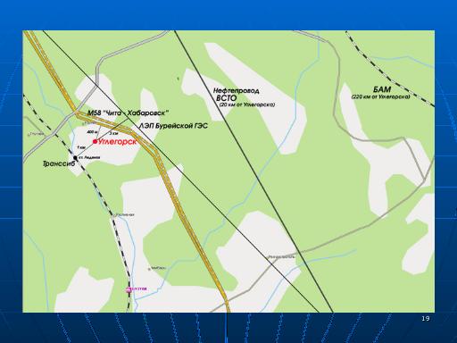 Also running through this corridor is the new East Siberia-Pacific Ocean oil pipeline, which is under construction 20 kilometers from Uglegorsk. Paralleling it in the area is the electric power transmission line from the Bureysk and Zeya hydroelectric power stations, which is 3 kilometers from Uglegorsk.