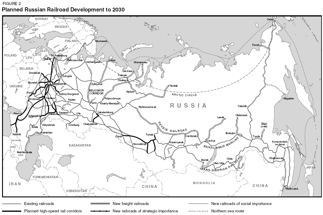 This EIR map of projected rail construction is based on a Russian Railways map titled “Prospective Topology of the Russian Federation’s Rail Network Development until 2030,” which was presented by a Russian Railways spokesman at the April 24, 2007 conference on the Bering Strait tunnel project. The SOPS organization, of which Victor Razbegin is deputy chairman, sponsored that Moscow event. Among the “railroads of strategic importance,” planned for construction between 2015 and 2030, is the 3,500-km line from the Lena River near Yakutsk to the Bering Strait at Uelen. Its spur to the coastal town of Magadan is designated as one of the “railroads of social importance,” which are connections to cities that would otherwise be isolated. The Yakutsk-Magadan rail segment is to be finished by 2015.