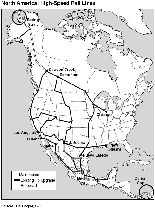 ![]() This proposal for a route for high-speed rail projects, stretching from the Bering Strait, to the Darien Gap, closely parallels the design for the NAWAPA water project (see Eurasian Land-Bridge Achieves Breakthrough in Canada) |
