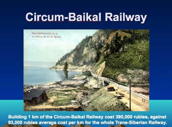 [Dr. Cherkasov shows historic photos of the Zabaikal Railroad, going eastward from Lake Baikal.] For a long time, before they started to build the Circum-Baikal Railroad, they used to transport cars from one side of Baikal to the other. In the Winter, they just put rails on the ice—it worked like that for about ten years. And in the Summer, they had a ferry which would take the cars, one by one, from one side to the other.