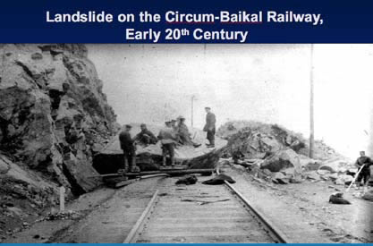 Figure 5 shows the Amur Railroad, going through a mountainous, rocky region. And Figure 6 is what I told you about: the Circum-Baikal Railroad: You can see, all the way, it goes between the coastline and hard rocks. The average price for the whole Trans-Siberian Railroad was 93,000 rubles, or about 18,000 cows, per kilometer; but this part was 390,000 rubles, nearly five times as expensive, because of very difficult conditions. Figure 7 shows one of the landslides that happened from time to time.