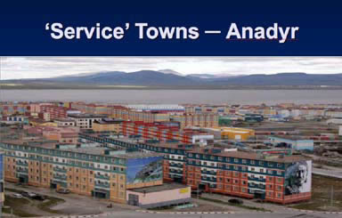 But there are different kinds of towns attached to the existing infrastructure corridors. I decided that we can call them “service towns.” One is Anadyr (Figure 11), the closest city to the Bering Strait, on our route. The population is about 12,000. Right now, it is functioning as a seaport, and thanks to our oligarch who is the owner of the Chelsea soccer club, you can see that Anadyr does not look too bad—quite attractive. It was absolutely different ten years ago, believe me. You would not have seen such colors; you would not have seen such buildings.