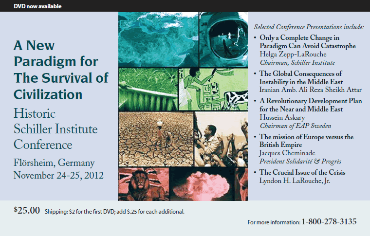 The Schiller Institute is pleased to announce the release of a DVD recorded from the proceedings of the Schiller Institute’s International Conference, held on November 24-25, 2012 in Flörsheim, Germany. The conference took place under the title “A New Paradigm for the Survival of Civilization”, and this leading imperative shaped the entire two-day event.