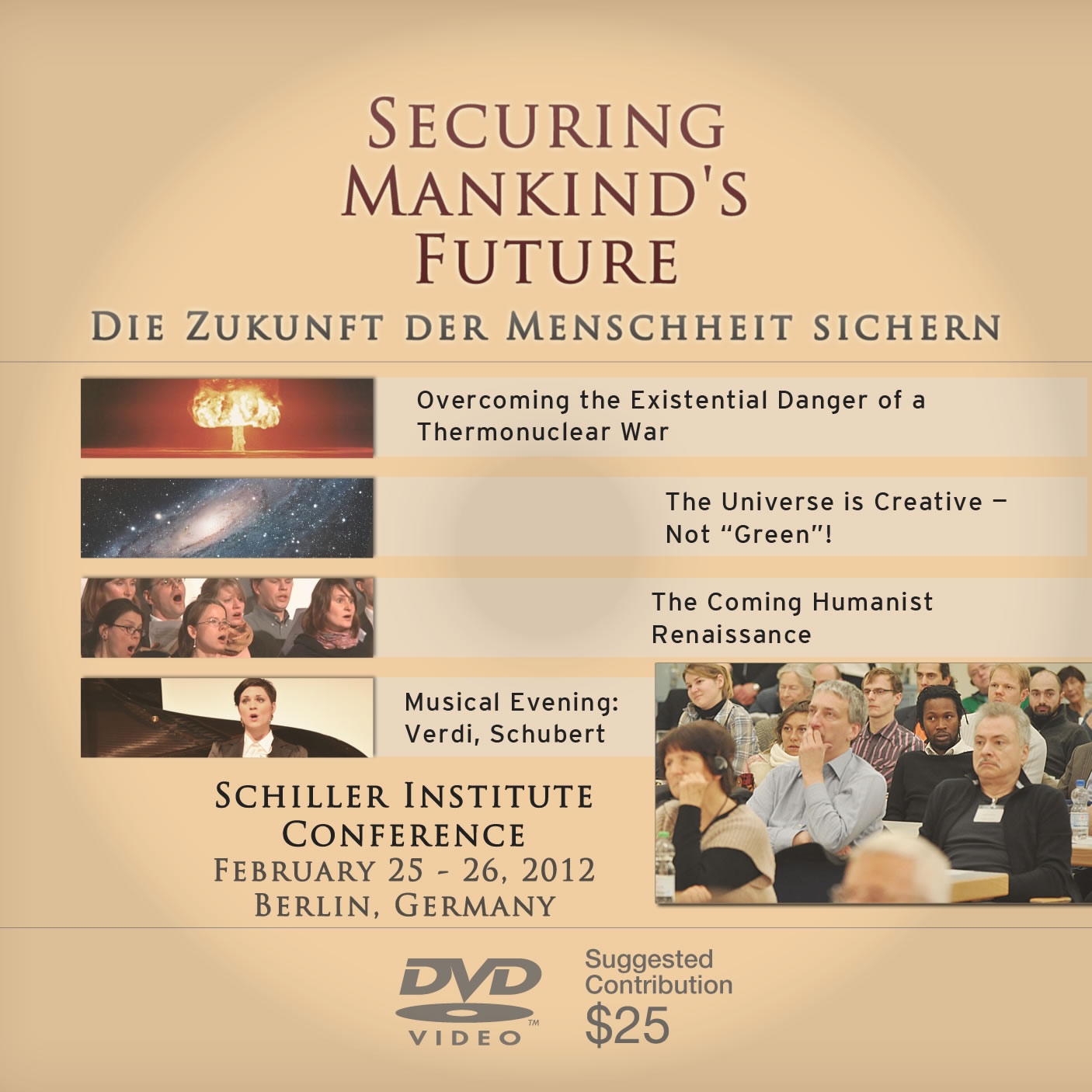 The Schiller Institute is pleased to announce the release of a DVD recorded from the proceedings of the Schiller Institute’s International Conference, held on February 25-26, 2012 in Berlin, Germany. The conference took place under the title “Securing Mankind’s Future”, and this leading imperative shaped the entire two-day event.