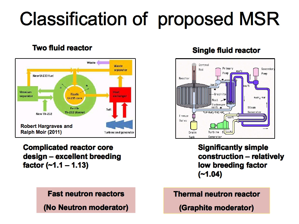 The single-fluid reactor is very much simpler, and has a low breeding factor, which means it burns more or less the same, or more, than what it is producing.