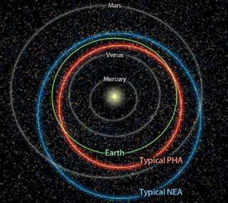 It’s time to get out there in the Solar System, and begin to control the threats to mankind from the flying rocks out there, of which there are millions, LaRouche urged. This NASA diagram illustrates the differences between orbits of a typical near-Earth asteroid/NEA (blue) and a potentially hazardous asteroid/ PHA (orange). PHAs have the closest orbits to Earth’s orbit, coming within 5 million miles, and are large enough to survive passage through Earth’s atmosphere and cause damage on a regional, or greater, scale. |