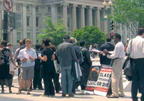 The Glass-Steagall policy, if applied, will save the United States, and Europe as well. Here, LaRouchePAC organizers in Washington, D.C., in front of the Treasury Building, May 2011. |