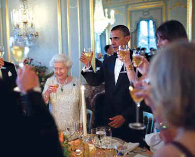 The British imperial policy—to reduce the human population by many billions—is now being implemented throughout Europe, and in the United States, as specified by the Queen of England and her puppet, President Obama (shown here in London May 2011), LaRouche declared. |