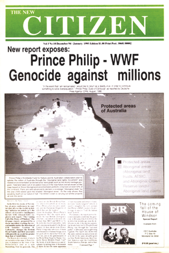 A special issue of the New Citizen, published in 2011, went after the core of British imperial policy—Green Fascism (Figure 12). We documented that the worldwide green fascist movement was hatched by the British Crown’s Privy Council following World War II, out of the British Eugenics Society. Queen Elizabeth’s immediate family took a leading role, beginning with her husband Prince Philip, co-founder of the family’s population-reduction charity, the World Wildlife Fund (WWF).