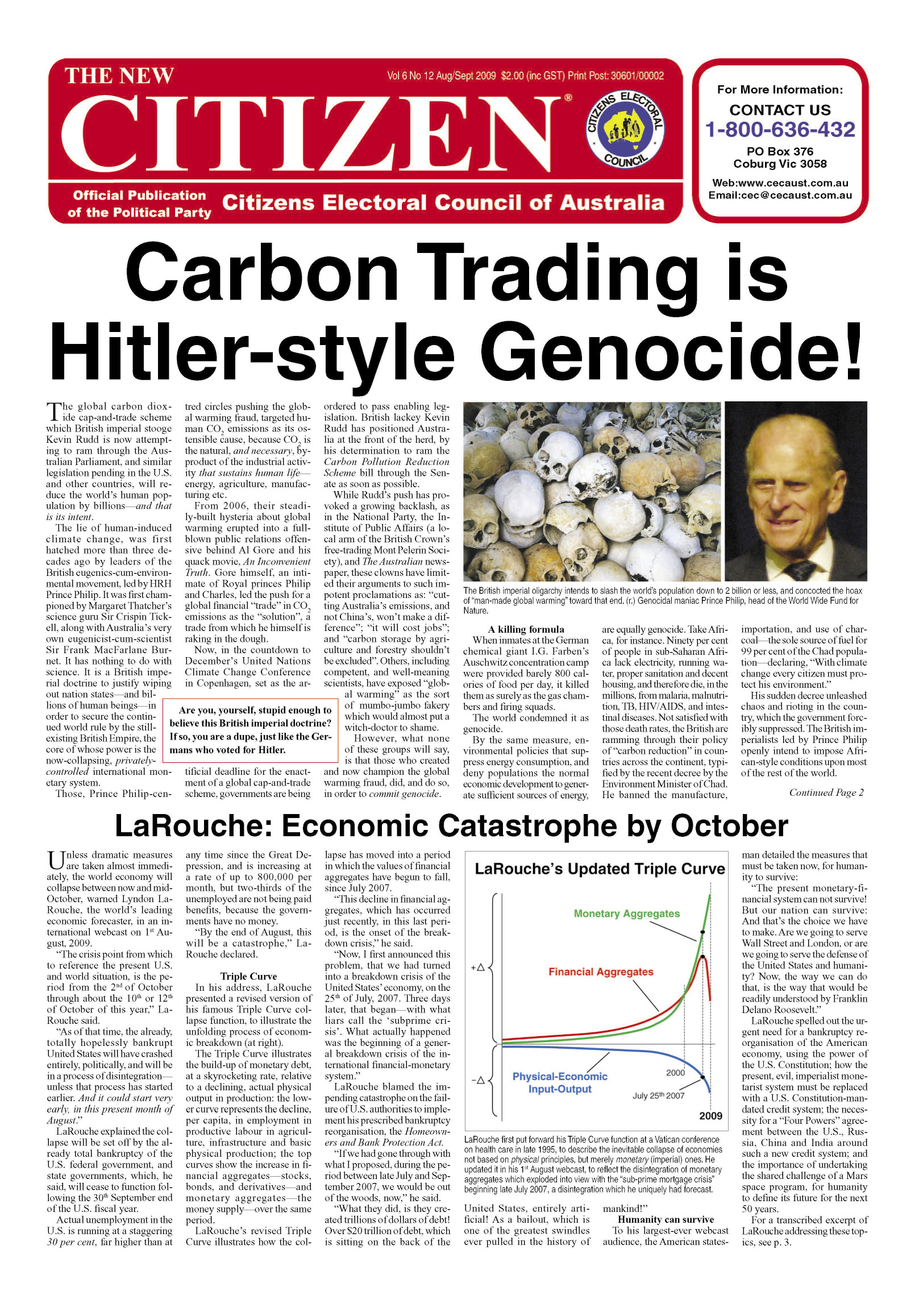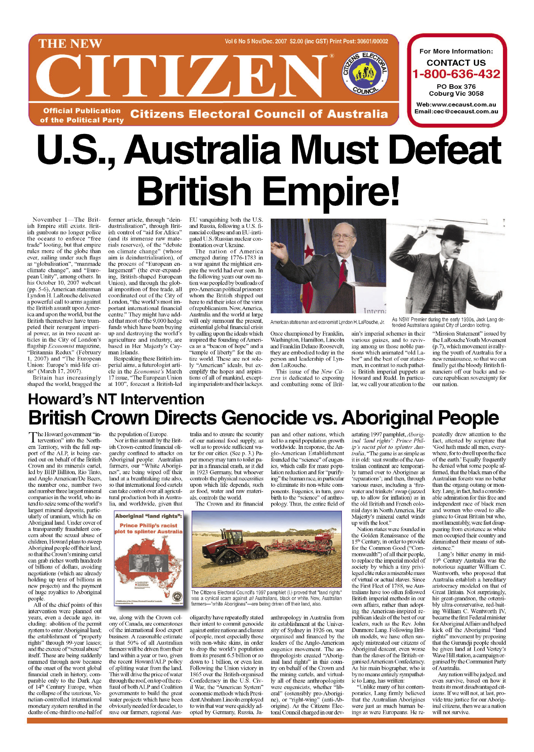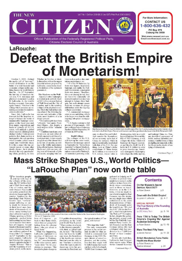 I would like to present to you the strategic vision of the Citizens Electoral Council of Australia, which is the LaRouche movement in our nation. Our vision is one of vast, physical-economic development, premised upon national banking and a public credit system. We intend to play our part internationally to defeat the genocide policies and war threats coming from the financial oligarchy, which Australians for over a century have called “the Money Power.” That financial oligarchy is based in the City of London and centered on the British Crown—and the wearer of that crown, the Queen of England, happens to be our official head of state.