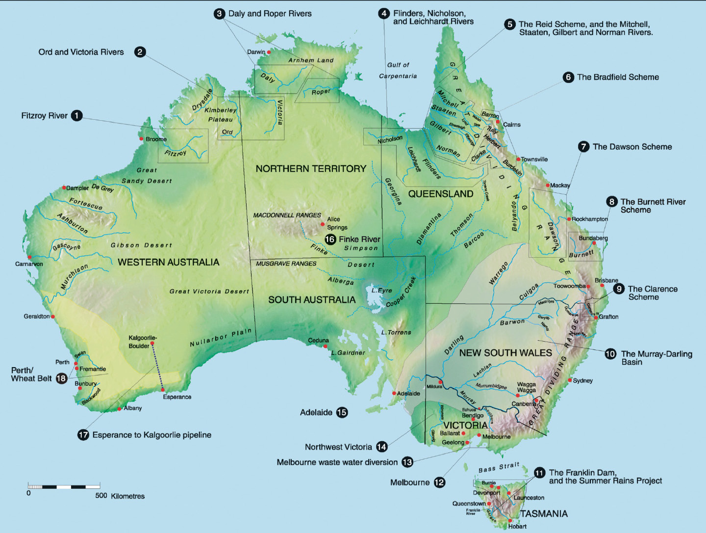 With indispensable advice and expertise from the late Prof. Lance Endersbee, who had been one of those dozen young engineers sent to America to be trained for the Snowy, the CEC, in 2002, drafted a program of nation-building for Australia. It includes advanced nuclear power, a nationwide maglev rail grid, space exploration (we have an excellent location for launches, being near the equator), high-speed shipping to tie us to the rest of Asia, and, of course, great water projects (Figure 6). We specified 18 water projects, many of which have been largely designed and are ready to go. Five of them are on the scale of the Snowy Scheme, transferring water from rivers in coastal mountain ranges, like the Clarence River in New South Wales on the East Coast, and the Fitzroy River in the West, inland to the arid regions.