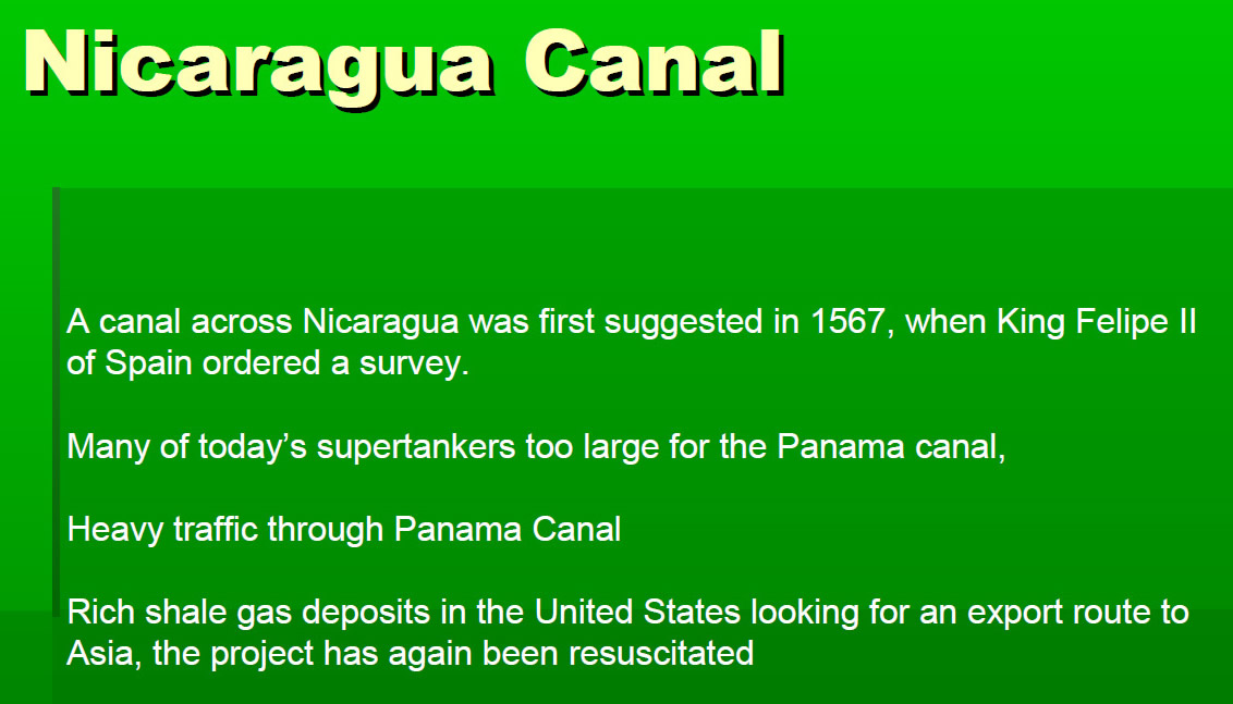 But have we heard new interesting, recent developments? Financially, is anyone interested in building it, picking up the big tab to go ahead with the construction of the canal, which is estimated, roughly, to be a $40 billion project? I told you that the container ships go through a series of locks and dams where the water level can be raised or lowered. So the canal can be raised to a much higher elevation, with water supplied from Lake Nicaragua. I also told you about the problems and considerations and the challenges.