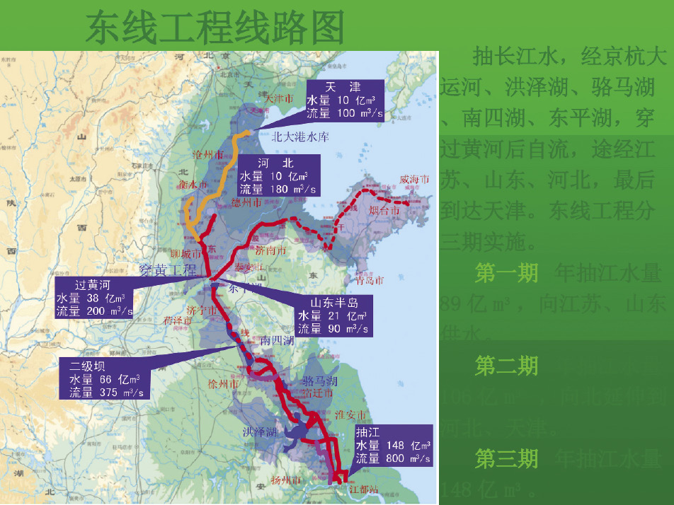 Let’s take a look at details of the Eastern route, The Eastern route (Figure 12), starting from the Yangtze River—you can see the three different phases. Phase 1, starting from the south, then going to the center, and there’s a tributary to the tip of the peninsula and all the way to the harbor city of Tianjin. It goes through a series of lakes, this part is already completed—the intake station at the Yangtze River is already constructed, completed, to take water from the Yangtze River and send it to the north.