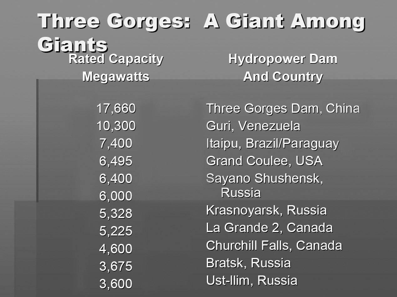 Well, let’s see, what is 1 gigawatt? Do you have any ideas? One gigawatt normally is the typical capacity of one nuclear power plant. So, to give you some idea: The Three Gorges Dam has a rated capacity, roughly, equivalent to 17.6 nuclear power plants. Do you know how much revenue it generates? Using ten years’ [average] price, it generates something like $17.6 million a day. What about the expense for producing the energy? The construction expense was very high, but the operating expense is very low, because you don’t have all the safety regulations that a nuclear power plant does. So, therefore, the advantage of hydropower is apparent.