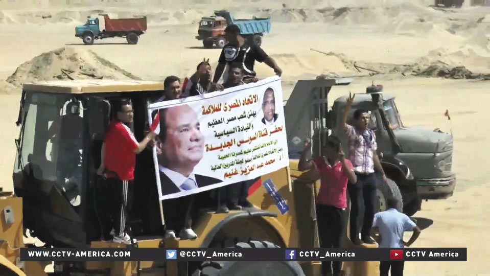 An early phase in the construction for doubling the capacity of the Suez Canal in Egypt, shown here in China TV coverage. The expansion project was completed in late July 2015 after one year. |