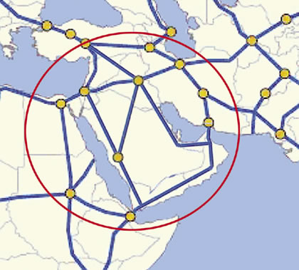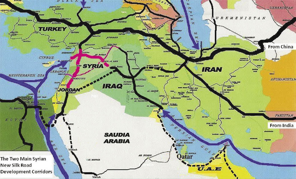 Maps depict routes for extending the New Silk Road Land-Bridge development corridors throughout the Middle East. Such a huge development perspective “from Afghanistan to the Middle East, to the Mediterranean, and from the Caucasus to the Persian Gulf,” is the only way to eliminate regional conflict and the resultant refugee crisis. |