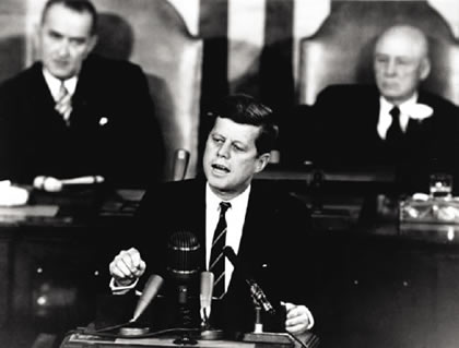 Kennedy, in a speech in Houston, Texas, Nov. 21, 1963, said he envisioned an “America strong in science and in space, in health and in learning, in respect of its neighbors and all nations,— an America that is both powerful and peaceful.” Here, Kennedy addresses a joint session of Congress, calling for the space program. |