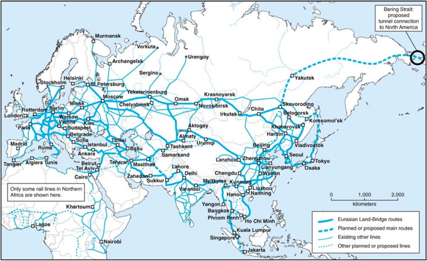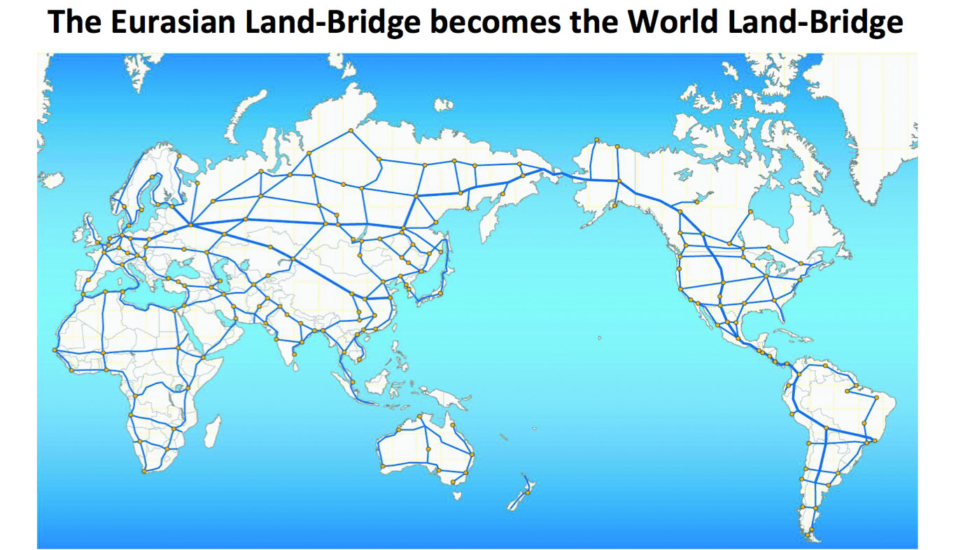 [Fig. 6] The LaRouche Movement has published numerous documents related to the World Land-Bridge, in which this concept is actually presented in a way that really provides the pathway to bring it to reality. With their leadership, with Lyn and Helga in particular leading the charge on this, this is gradually becoming a reality, and of course, the very critical support of the government in China and the neighboring countries—which needs to be extended through Russia to the United States. It’s very important to connect the Bering Strait and the critical landmass between Europe and Asia, so that world development becomes Pacific-centered, rather than Atlantic-centered, which is based on stagnation as we’re seeing, because of the London-New York axis, which unfortunately still has too much influence in the United States.