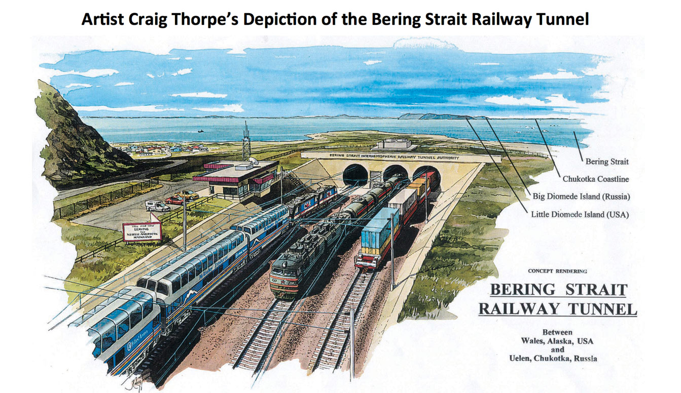 [Fig. 9] I commissioned Craig Thorpe to do a painting of what the Bering Strait Tunnel would look like if it were to be built. This is the eastern entrance of what the tunnel would look like, near Whales, Alaska at the end of the Seward Peninsula, as a three-track line. Then it would have passenger trains and freight trains, including a Russian locomotive hauling oil. There are considerable minerals in Alaska—coal, potash, oil, etc.—a lot of which could be hauled by rail.