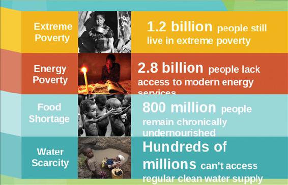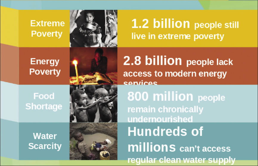 Looking around the world today, however, we must acknowledge serious challenges: despite the impressive economic growth of recent decades, 1.2 billion people still live in extreme poverty. As many as 2.8 billion people lack access to modern energy services, and 800 million people remain chronically undernourished. Hundreds of millions have no access to a regular clean water supply, while billions live without basic sanitation facilities.