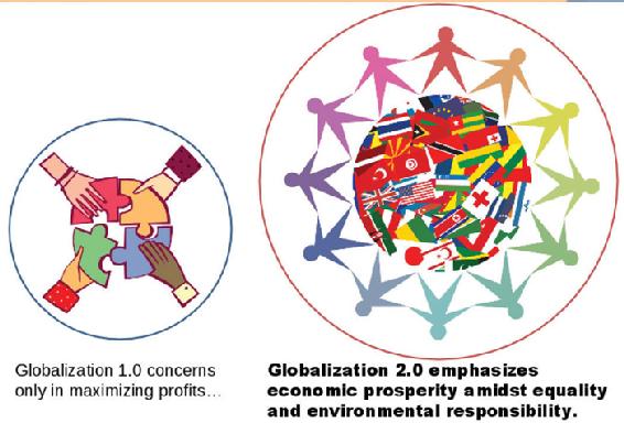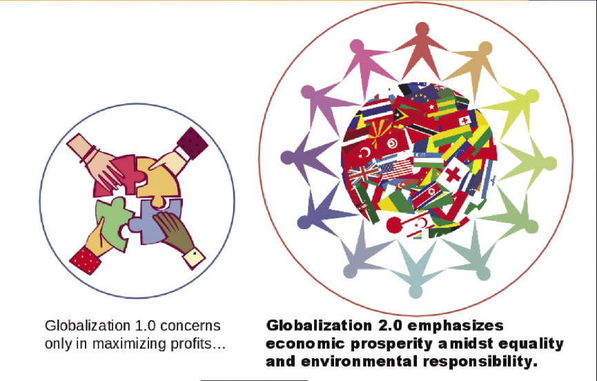 Whereas Globalization 1.0 concerns itself only in maximizing profits, Globalization 2.0 emphasizes economic prosperity amidst equality and environmental responsibility.