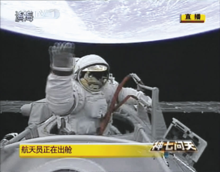 Chinese astronaut Zhai Zhigang waves to the camera as he conducts China’s first spacewalk, in this video grab taken on September 27, 2008. |