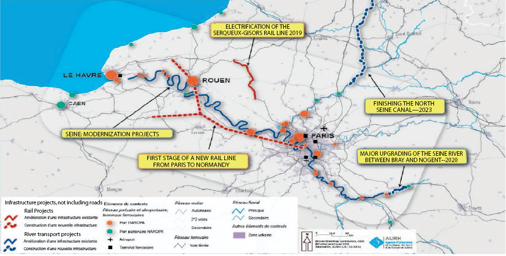 Graphic showing the improvements of existing infrastructure and construction of new infrastructure to greatly expand the French economy by improving the contribution made by the port at Le Havre. |