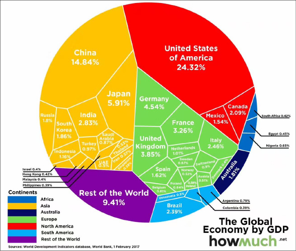 So, when we think about China, there are two pictures of China, that is, generally speaking. If you go into details, there are a thousand different pictures of China. Those general two pictures—one is a rising power, seems very strong; this is the second biggest economy already, but—let me show the picture here—here is the general picture about China, this is the Global Economy by GDP. When we see the top right, United States of America, accounts for 24.32% of total global GDP; and then, to the left top, that’s China, the yellow one—China accounts for 14.84% of global GDP. And then, a lot of others have double-digit percentages of GDP. So, in general, China is very powerful now.