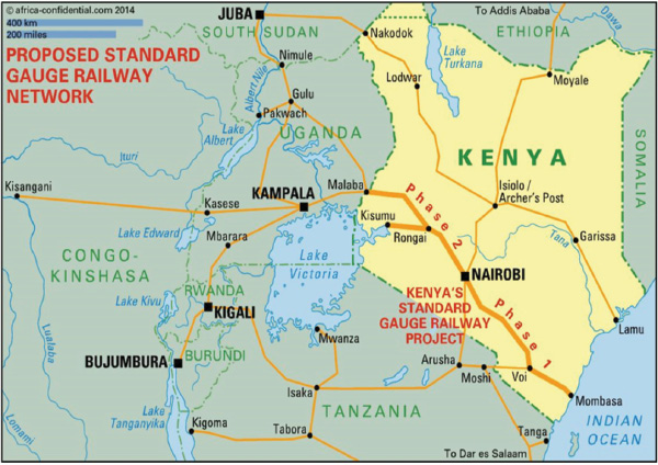 Just to show you another infrastructure map: the Mombasa to Nairobi railway that was just finished at the end of May. We are going to build the second phase, from Nairobi all the way to Malaba in Uganda, and then that’s an East African Community network. When this railway was finished—this is President Uhuru Kenyatta, saying this laid the foundation for industrialization. This shows people celebrating this railway connection, and this shows a man holding a paper saying “Comfortable, convenient, very soft, safe, and very beautiful.” And here, very beautiful at 100 years old, a grandmother. [applause]