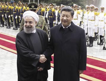 Iranian President Hassan Rouhani presents Xi Jinping at the welcoming ceremony in Tehran. |