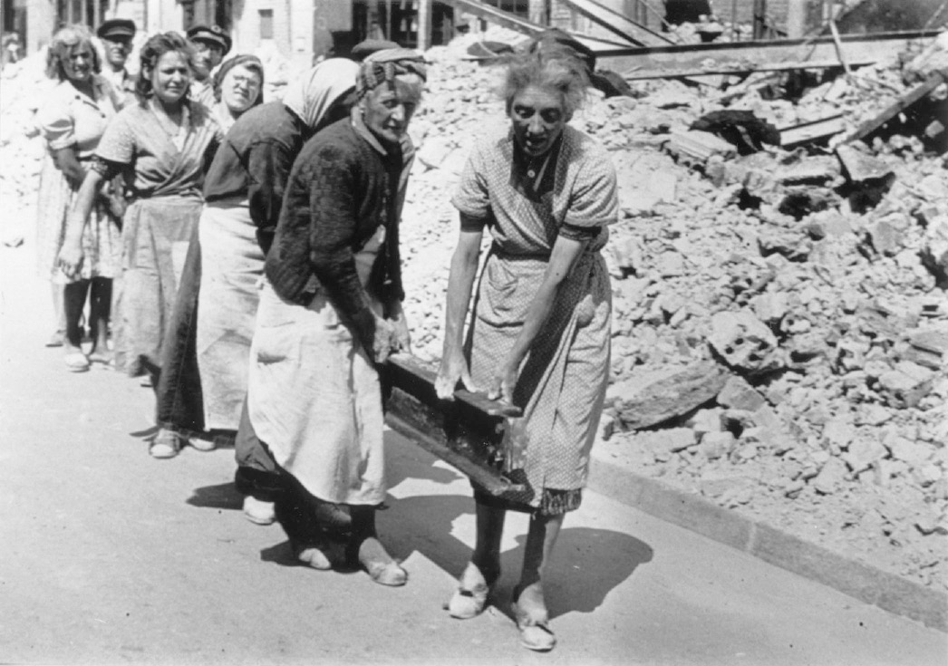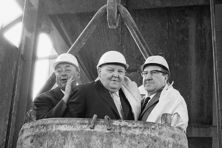 The “Economic Miracle” rebuilt West Germany from total devastation right after the war (shown here, left, in Berlin in 1946). On the right is Chancellor Erhard (center), riding in a bucket used for hoisting coal at the Friedrich der Grosse mine in North-Rhine Westphalia (the governor of the state, Franz Meyers, is on the right).
