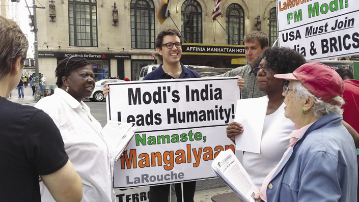LaRouchePAC organizers at New York’s Madison Square Garden for Prime Minister Modi’s speech. The Mangalyaan is India’s Mars orbiter. |