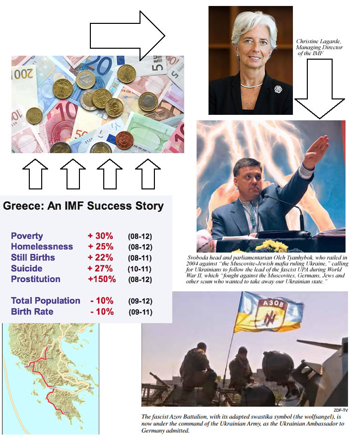 At the same time Ukraine is heading for imminent default, though on a much smaller government debt than Greece. The Ukrainian economy has fallen into utter collapse and hyperinflation in the year since its association agreement with the economically dead EU. But here, the huge difference is being outside the euro, and at war with Russia, is evident; the IMF is organizing the default and debt writedown. Ukraine central bank Governor Valeriia Gontareva, defying attacks on her from Nazi Premier "Yats," has announced more and more strict capital controls and exchange controls since Feb. 22, on orders from Lagarde ("in consultation with" Lagarde as Gontareva put it). The IMF is ordering Ukraine to impose capital controls while ordering Greece not to impose them.