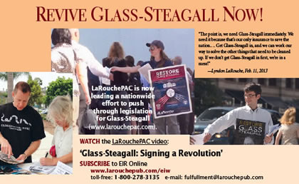 The Presidential campaign has become a sounding board for the beginnings of a discussion of Glass-Steagall, but that must now become a stampede for action, while it is still possible to prevent the devastation that otherwise awaits us under the British Empire and Obama’s rule. It is time to listen to the wise words of Lyndon LaRouche: “What you have to do is, pose out the fact that there will be no solution, unless Wall Street is put out of business right now. And that’s what Franklin Roosevelt did in effect. He shut down Wall Street.”