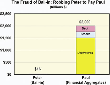 Bail-in has been sold to the public as the way to make sure that another Lehman-style 2008 financial crisis never occurs. Instead of using government funds to bail out failing banks through Quantitative Easing and similar hyperinflationary measures, the bankrupt banks purportedly will instead be kept afloat by a bail-in of certain categories of deposits in the banks, and certain categories of bonds of the banks. In other words, depositors and some investors will be expropriated, in order to salvage the cancerous financial bubble. This is what was done in Cyprus when its banks went belly-up in 2013, and it was then promoted as the “Cyprus template” for all of Europe by Eurogroup President Jeroen Dijsselbloem.