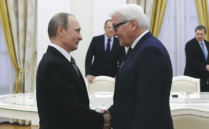 President Vladimir Putin (left) shown meeting at the Kremlin with German Foreign Minister Frank-Walter Steinmeier, March 23, 2016. |