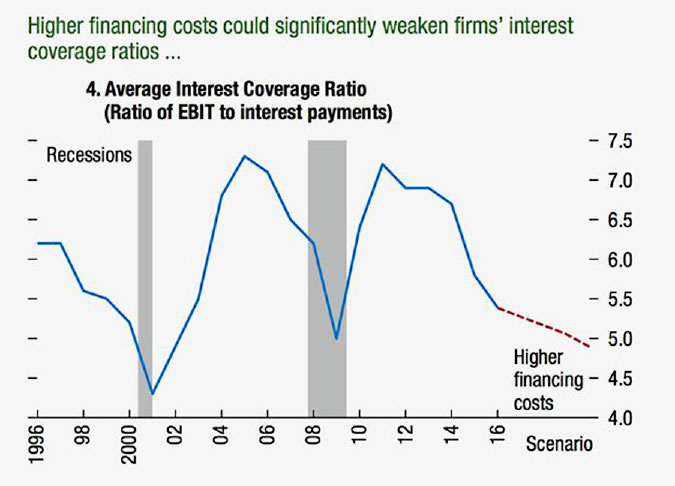 • The IMF 2017 “Global Financial Stability Report” finds that in the United States, the debt service to income ratio of non-financial corporations has risen quickly from 37% in 2014, to 41% in 2016. Those corporations have $7 trillion more debt than at the 2008 crash, but $3 trillion less equity invested in them.