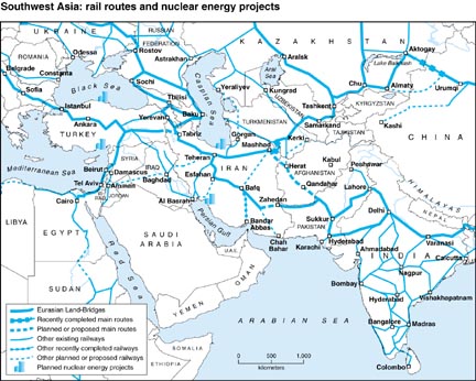 1) High-speed rail lines through the region, connecting Africa, Asia, and Europe , which presumes a grid of other main lines, and secondary and local lines throughout the Greater Middle East area.