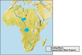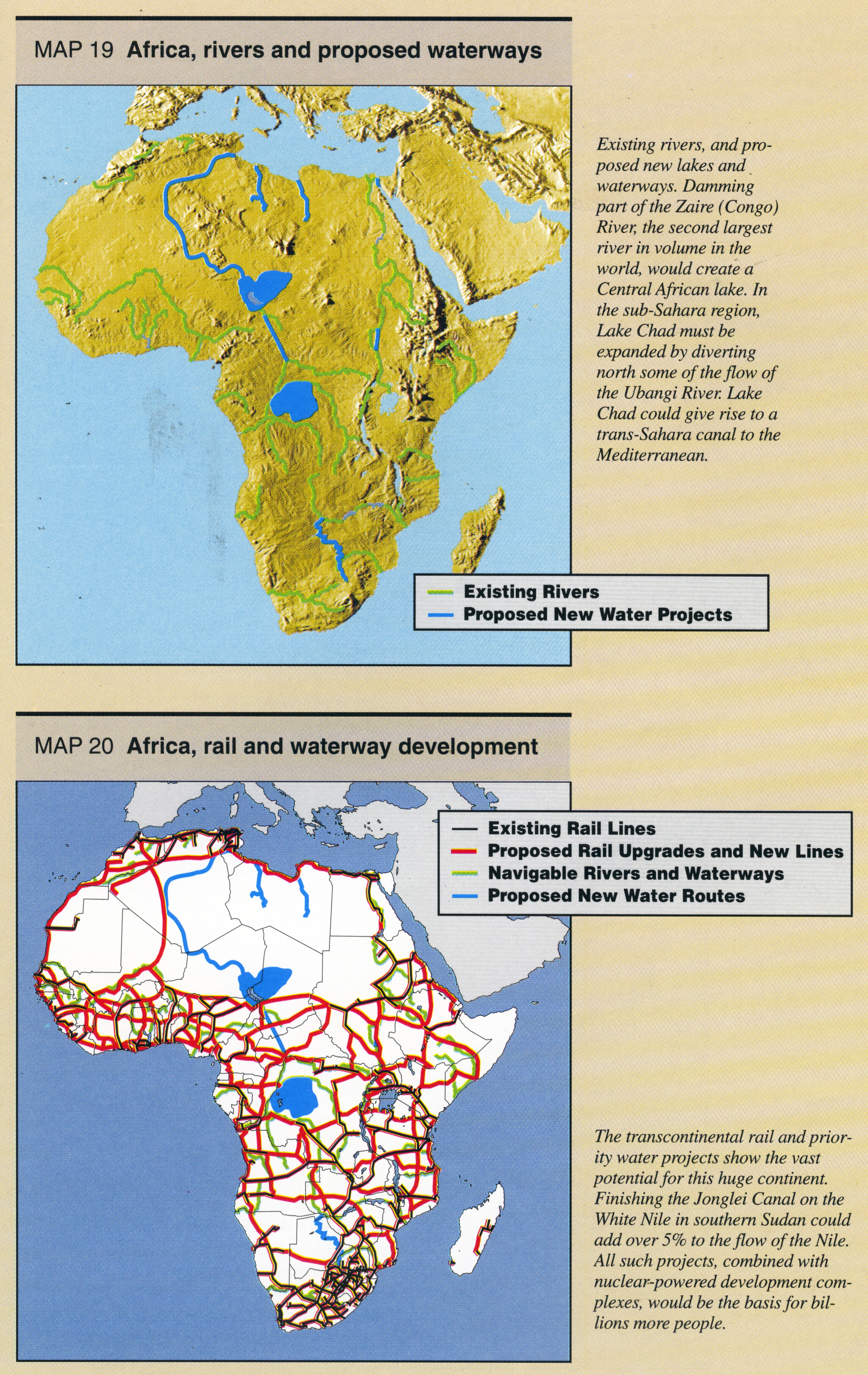 The plans exist for greening the desert, for expanding waterways, for building rail links and ports, for power, for new cities and agriculture regions. For example, in southern Sudan, over 150 kilometers of a big trench on the upper White Nile was dug (completing half of the proposed Jonglei Canal), and then had to be abandoned, because of IMF-era international opposition.