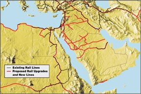 Arab rail grid proposals. In the Arabian desert there are ruins of the 19th-century Berlin-to-Baghdad rail system that was dynamited by British terrorists. New rail lines and upgrades of existing lines are shown . These include selected links from Jordanian, Palestinian, and other proposals. In Saudi Arabia, parallel trans-Arabian lines are shown.