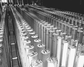 The Manhattan Project devised this method of gaseous diffusion with incredible speed and secrecy. It was not finished in time to produce all the uranium for the uranium bomb dropped on Japan, but it produced most of the enriched uranium for the civilian and military programs in subsequent years. Although a successful method, it required a tremendous amount of energy and a huge physical structure to house the cascades of separate membranes. Four power plants were built in Oak Ridge, Tenn., to power the process, producing as much electric power as the consumption of the entire Soviet Union in 1939! Almost all the power consumed in the diffusion process is used to circulate and compress the uranium gas. Technological pessimists take note: At the time the gaseous diffusion plant was being built, scientists had not yet figured out how to make a membrane to be used in the processbut they did it in time to make it work! The centrifuge system, used in Europe and Japan, is 10 times as energy efficient. The strong centrifugal field of a rotating cylinder sends the heavier isotope in uranium hexafluoride to the outside of the cylinder, where it can be drawn off, while the U-235 diffuses to the inside of the cylinder. Because of the limitations of size of the centrifuge, many thousands of identical centrifuges, connected in a series called a cascade, are necessary to produce the required amounts of enriched uranium. A centrifuge plant requires only about 4% of the power needed for a gaseous diffusion plant, and less water is needed for cooling. Other methods of enrichment are possibleelectromagnetic separation, laser isotope separation, and biological methods. Fabrication Into Fuel Rods