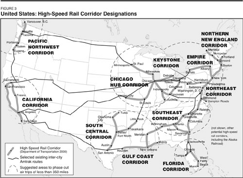 This map shows the 12 high-speed rail corridors proposed by the U.S. Department of Transportations High-Speed Train division in 2000; they would cover 12-15,000 miles in the most densely populated area, and cost between $50 billion and $75 billion (in constant 1998 dollars), over 20 years. Only one such corridorthe Northeastis in operation right now.