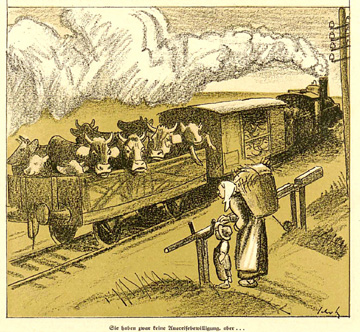 ![]() “They certainly don’t have a visa...” From Simplicissmus, 1923. The Versailles Treaty was not simply a monetary prison for the Germans. The bulk of the reparations required Germany, a food-importing nation, to fork over livestock and farm goods to the Allied nations. The intent was not to repair the damage supposedly done by Germany during the war, but to destroy Germany and her people. |